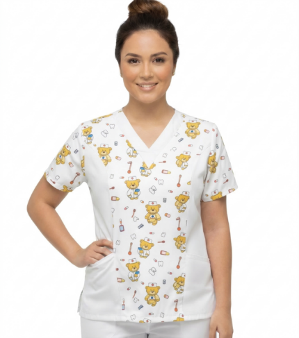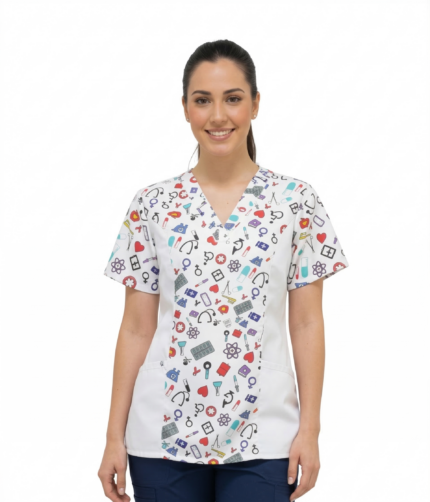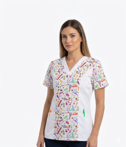 Blusa Blanco Cuello V Antifluido Estampado Laboratorio.