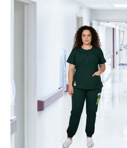 Uniforme Antifluido Verde Oscuro con Cierre Frontal y Apliques Animados