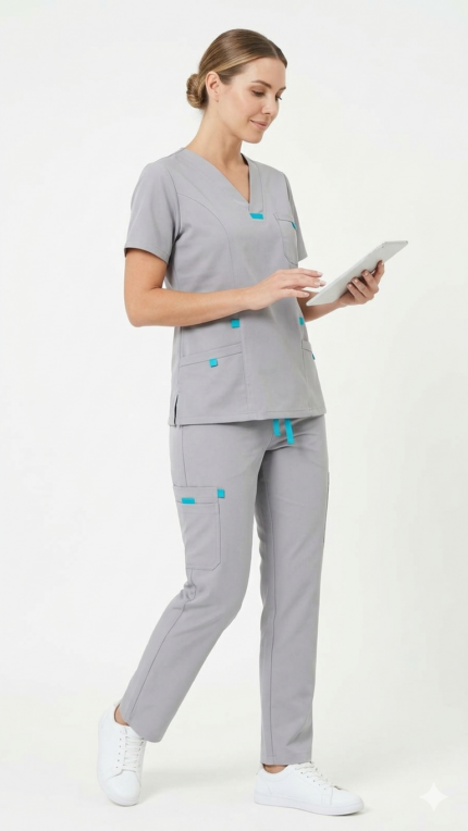 Uniforme Gris Perla Cuello V Con Vivo Aguamarina Lotus Lycra Lafayette