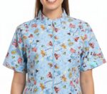 Blusa de uniforme para mujer con cuello tipo coreano y cierre frontal de cremallera. Presenta un diseño alegre en color azul celeste con un estampado detallado de personajes clásicos, ideal para profesionales de la salud o educación que buscan comodidad y estilo.