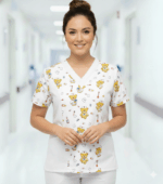 Blusa cuello V clásico, con dos bolsillos al frente, estampada antifluido Enfermería Oso.