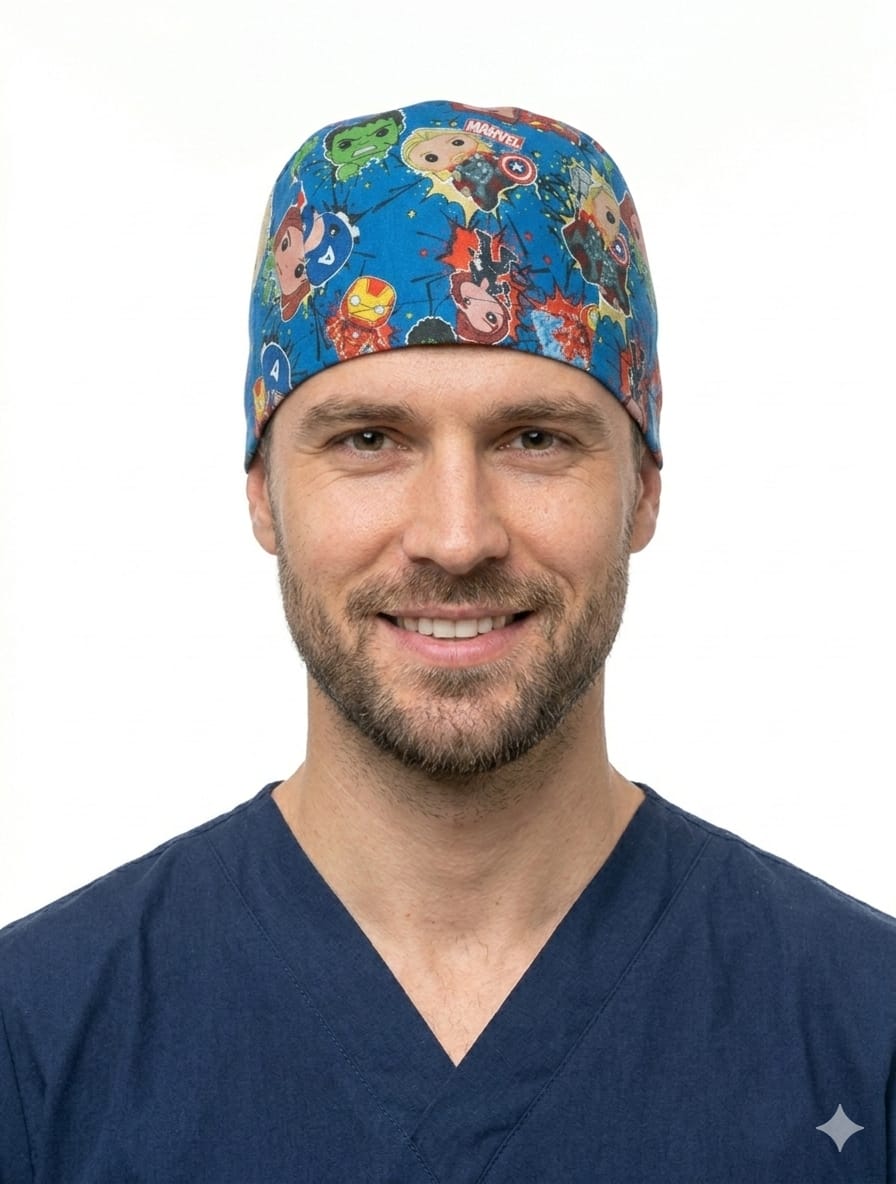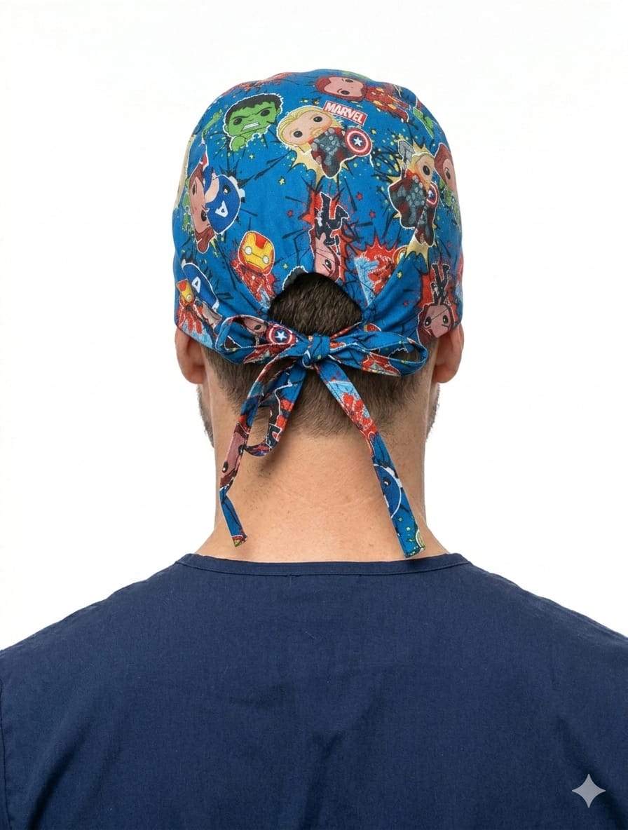 Este gorro de enfermería antifluido destaca por su diseño dinámico y divertido con temática de superhéroes, ideal para profesionales que buscan añadir un toque de personalidad a su uniforme sin sacrificar la protección. Fabricado con una tela técnica de alta calidad que repele líquidos y salpicaduras, ofrece una barrera higiénica eficaz y duradera, mientras que su ajuste ergonómico mediante tiras posteriores asegura comodidad total y un entalle perfecto durante las jornadas más exigentes.