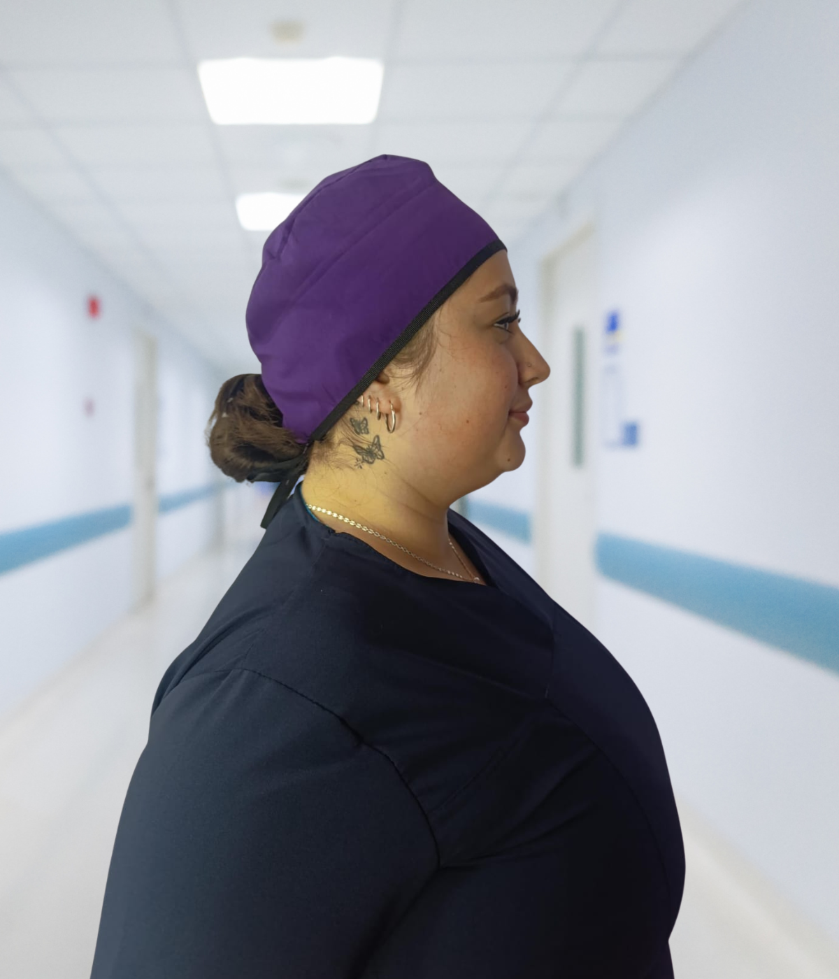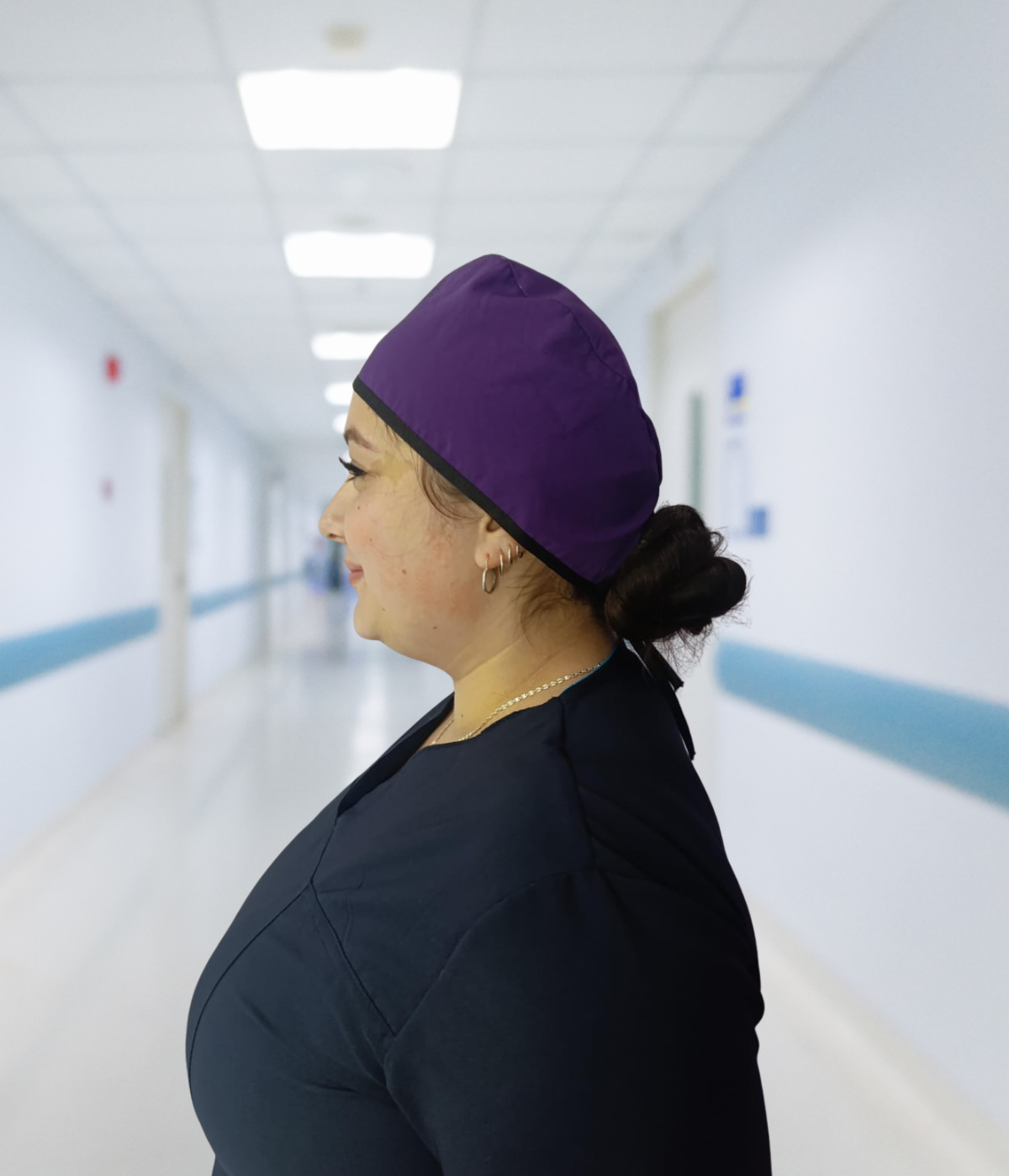 Su diseño liviano y adaptable incluye una banda posterior ajustable que garantiza un ajuste cómodo para todo tipo de cabello, sin generar presión ni incomodidad. El tono morado oscuro aporta un aspecto sofisticado, sobrio y moderno, ideal para complementar cualquier uniforme médico, estético, veterinario, de spa o cocina.