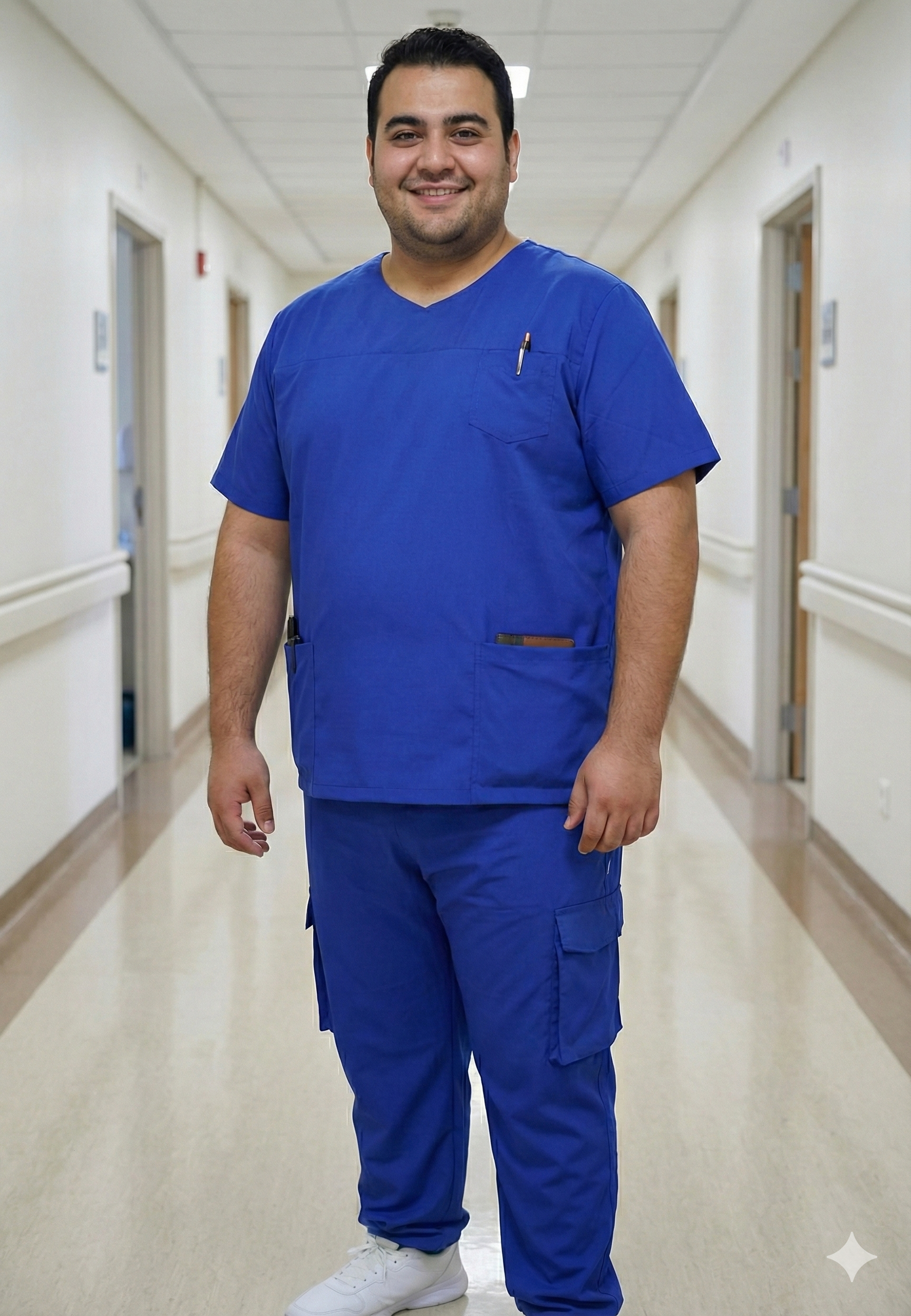 Uniforme médico antifluido azul royal unisex. Fresco, funcional y resistente para profesionales que buscan comodidad y estilo.