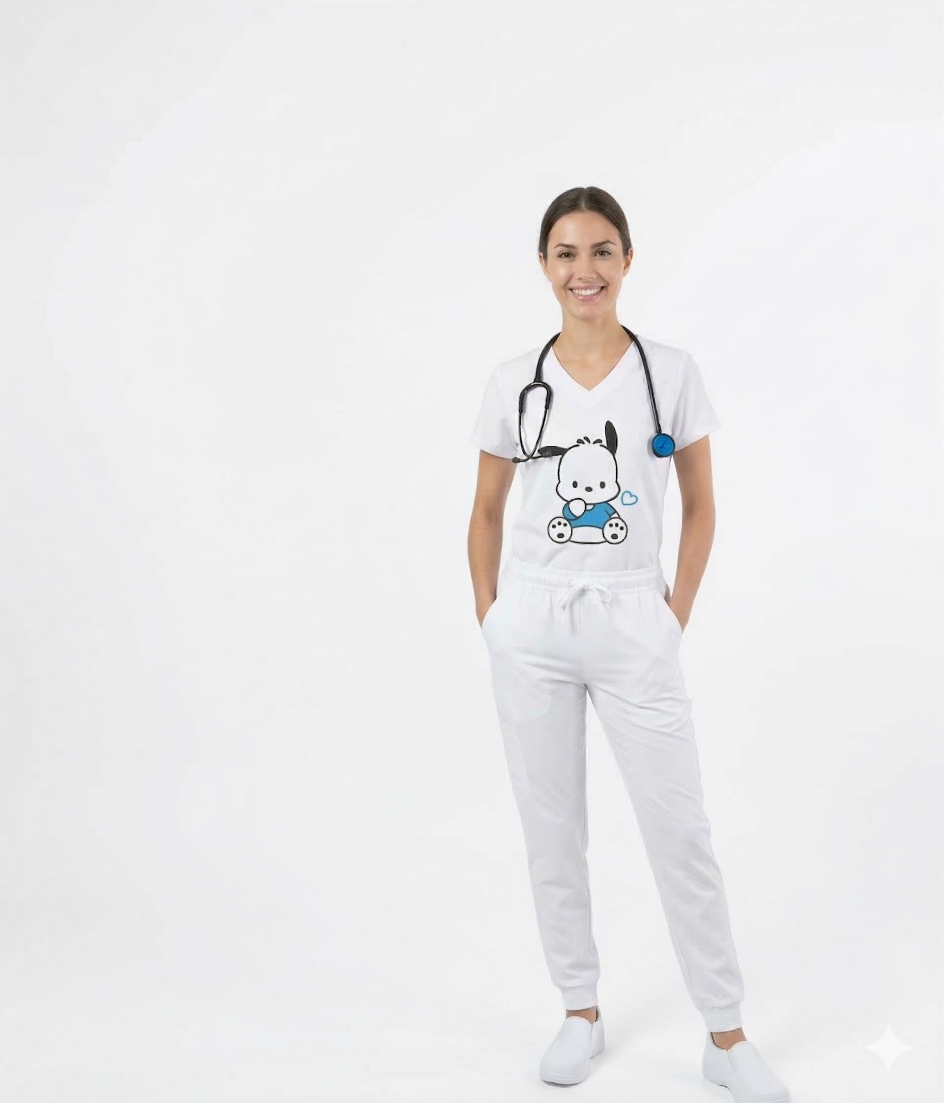 Protección, frescura y estilo en un solo uniforme. Confeccionado en lycra antifluido color blanco, con un estampado adorable que aporta un look profesional y alegre.