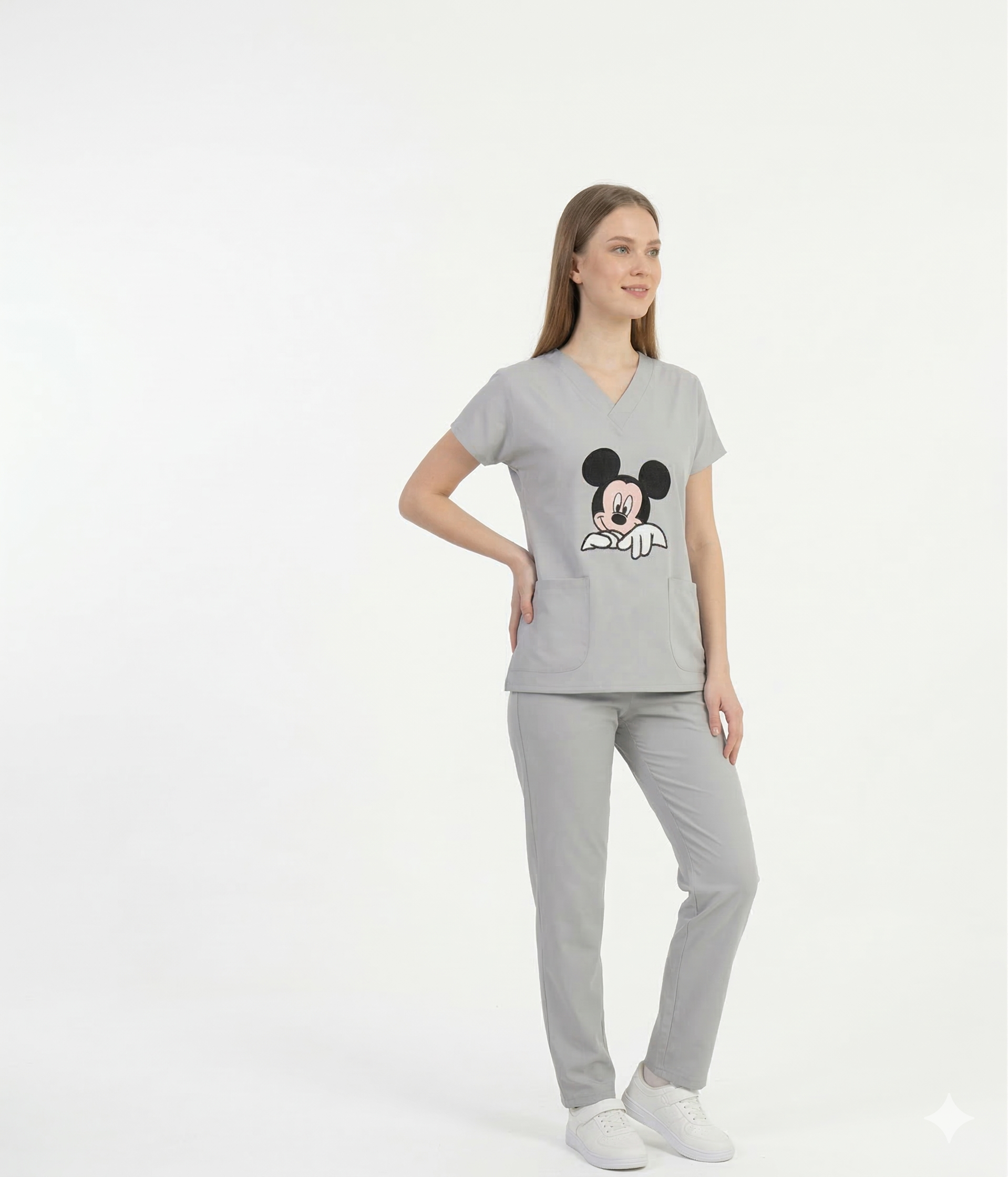 Uniforme médico antifluido en tela Camel Lycra Lafayette, color gris Perla con diseño de Mickey. Comodidad, estilo y practicidad en una sola prenda.