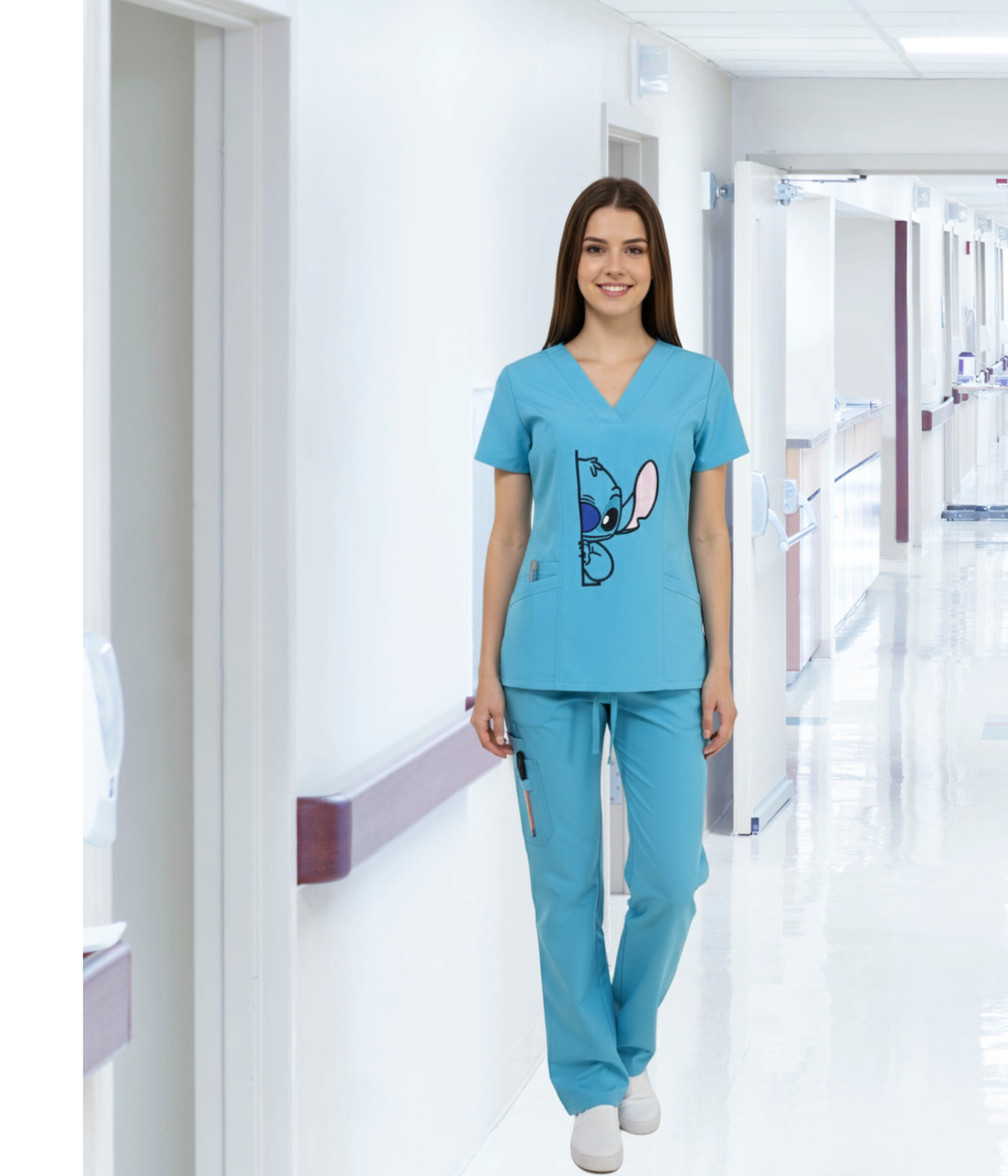 Uniforme Médico Antifluido Agua marina con Bordado Divertido de Stitch