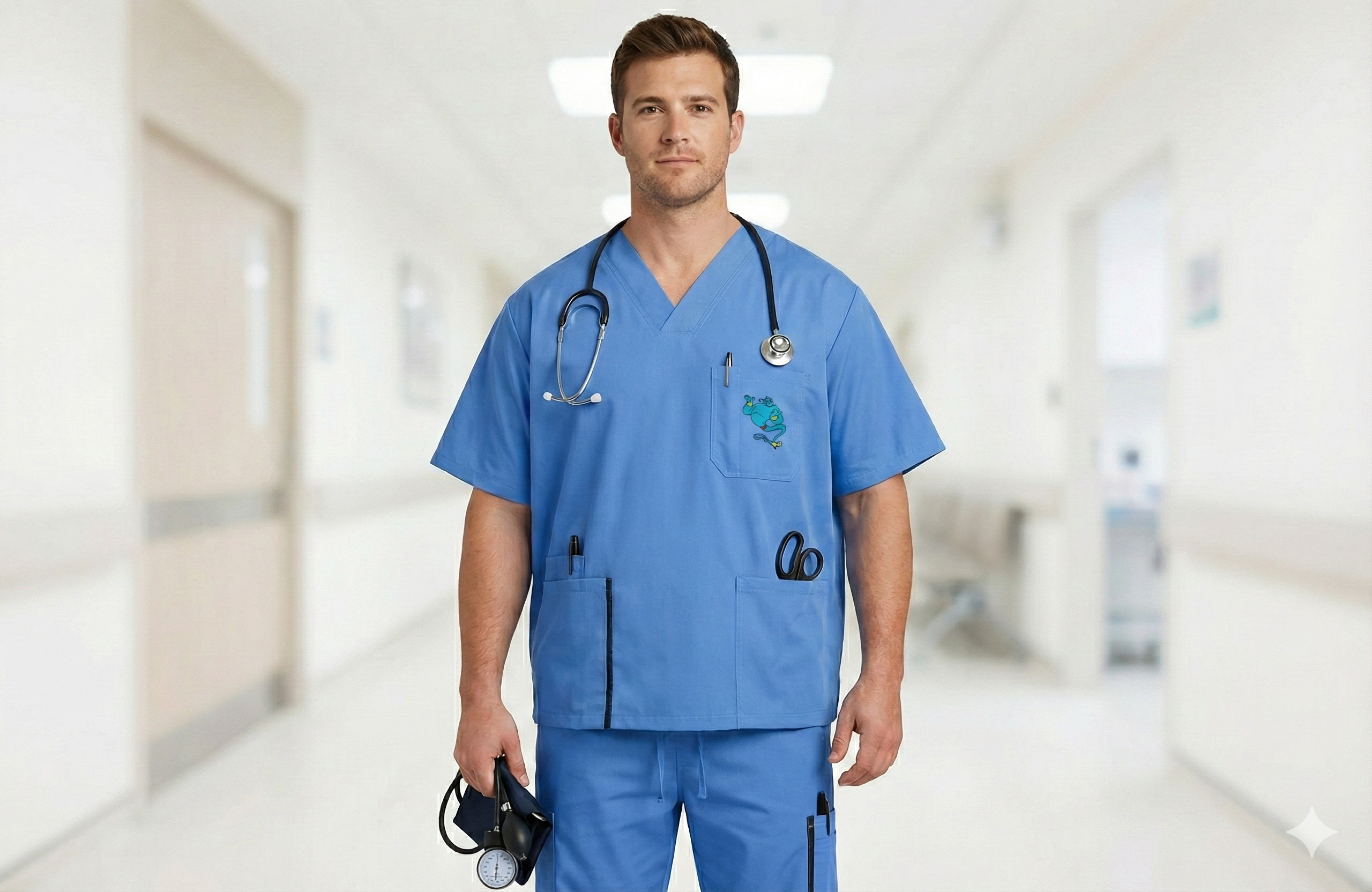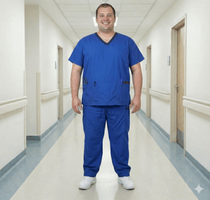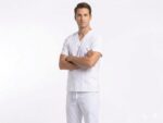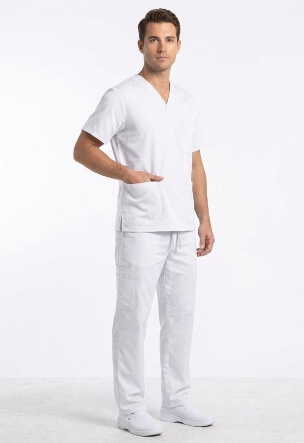 Este uniforme médico de dos piezas destaca por su vibrante blanco y un diseño funcional pensado para la comodidad durante largas jornadas laborales. La parte superior cuenta con un cuello en V, mangas cortas y tres amplios bolsillos frontales para facilitar el almacenamiento de herramientas esenciales, mientras que el pantalón incorpora una cintura elástica ajustable con cordón y prácticos bolsillos laterales tipo cargo que maximizan su utilidad. Confeccionado con un corte holgado y profesional, este conjunto proyecta una imagen impecable y moderna, ideal para profesionales de la salud, estética o servicios veterinarios que buscan libertad de movimiento y resistencia.