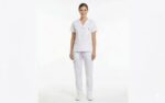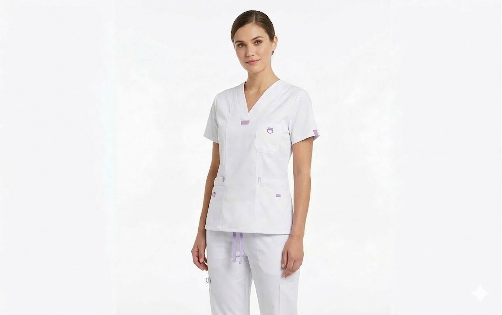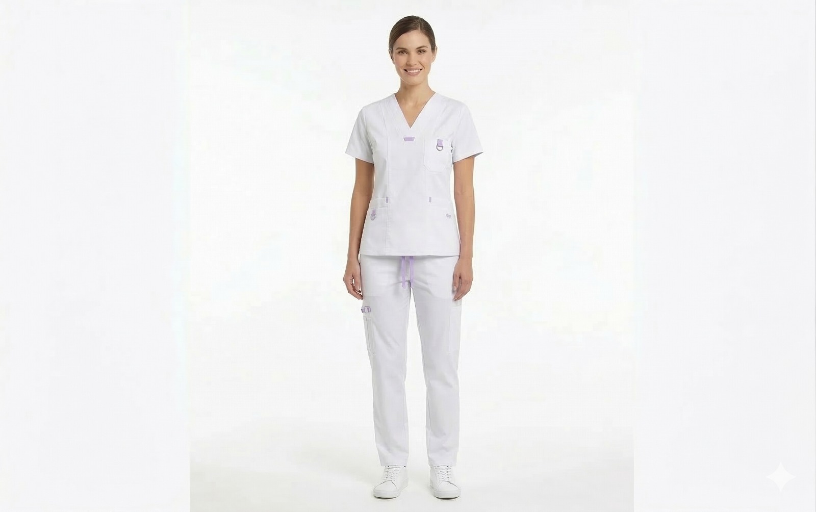 Este uniforme médico en color blanco impecable proyecta una imagen profesional y pulcra, destacando por sus detalles funcionales y un toque distintivo. La blusa de cuello en «V» incorpora elegantes vivos grises en el escote y bolsillos, incluyendo argollas metálicas para accesorios y un simpático parche de personaje médico que añade personalidad al diseño; el conjunto se complementa con un pantalón de bota recta que asegura confort total mediante su pretina elástica con cordón ajustable en color lila y un práctico bolsillo lateral tipo cargo, ideal para las exigencias del día a día.