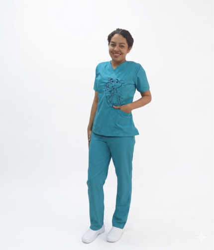 Uniforme Antifluido Agua Marina con Diseño Bordado Pantera Rosa – Estilo Profesional y Confort