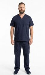 Este conjunto médico en azul noche combina funcionalidad y estilo profesional, diseñado para ofrecer comodidad total durante la jornada laboral. La filipina presenta un corte clásico con cuello en V y múltiples bolsillos frontales para fácil acceso a herramientas de trabajo, mientras que el pantalón tipo cargo destaca por su cintura elástica ajustable y prácticos bolsillos laterales que añaden versatilidad. Es una prenda resistente y de diseño limpio, ideal para profesionales de la salud que buscan proyectar una imagen impecable y moderna.
