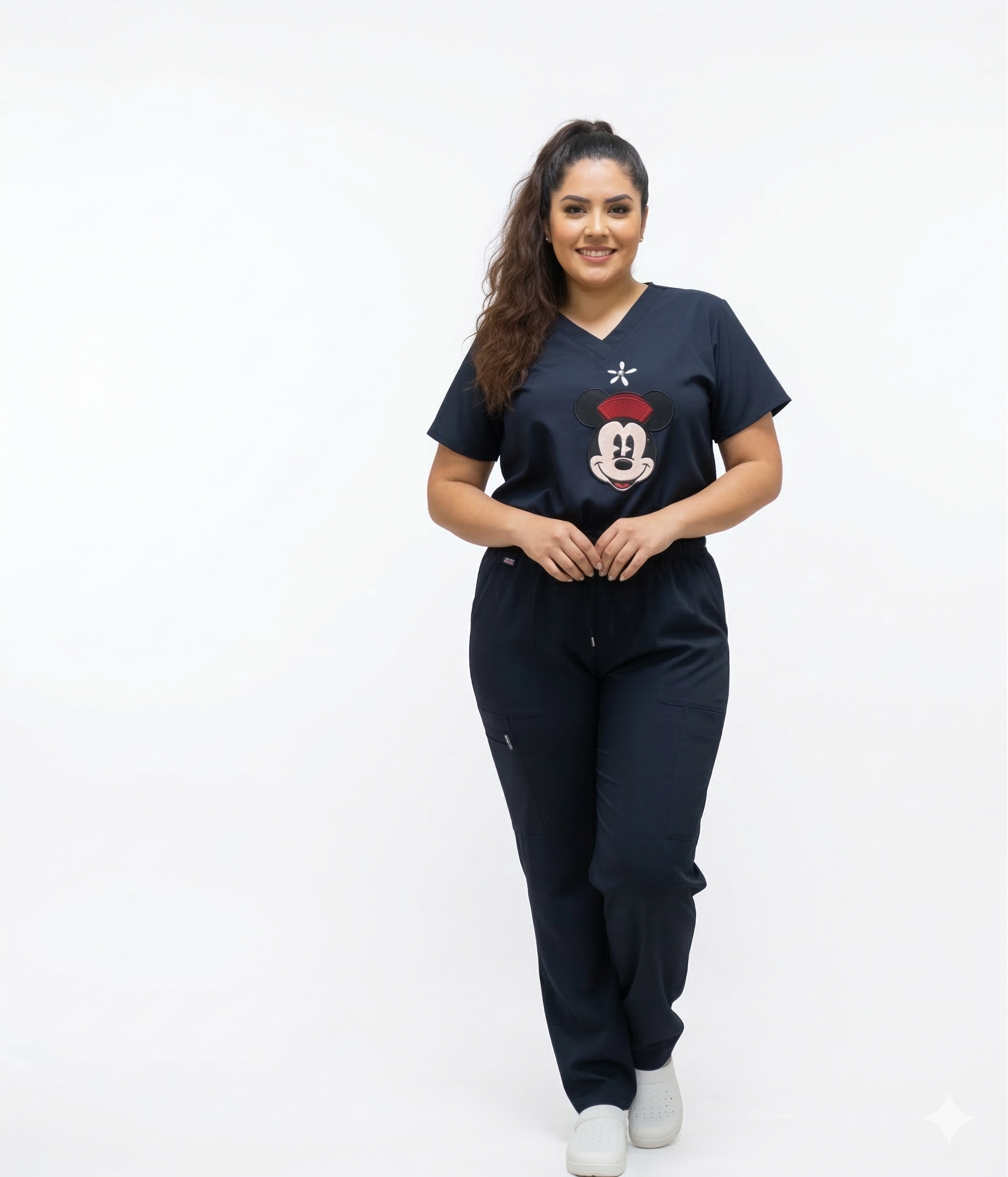 Uniforme médico antifluido azul noche con bordado de Mickey. Cómodo, funcional y lleno de estilo para tus días de trabajo.