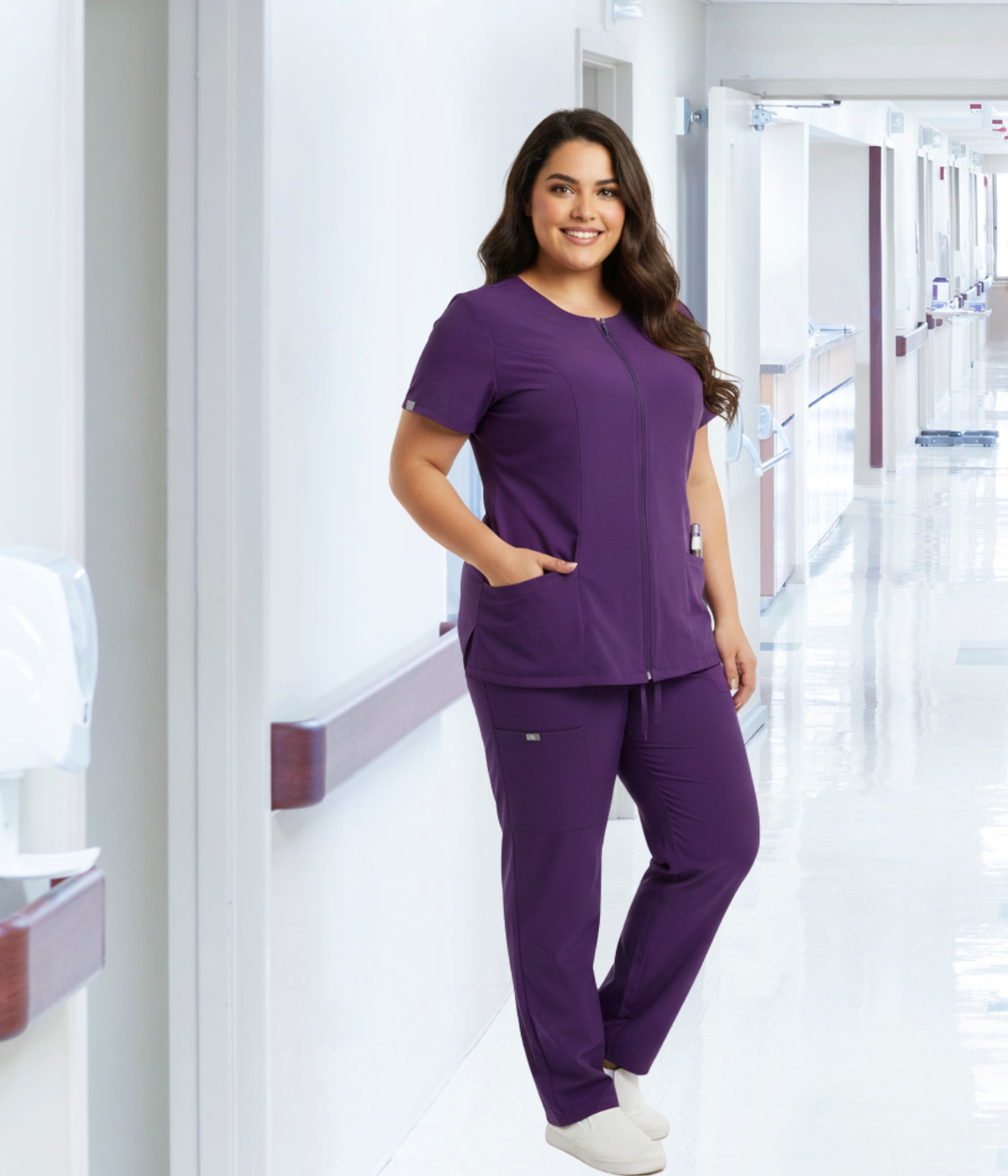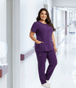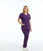 Descubre el equilibrio perfecto entre elegancia y funcionalidad con este uniforme médico antifluido color morado, ideal para profesionales de la salud que buscan comodidad sin perder estilo.