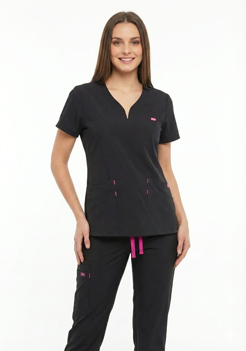 Este conjunto premium está diseñado para profesionales que no quieren sacrificar el estilo por la funcionalidad. La blusa cuenta con un cuello en V con un moderno detalle en el escote y costuras reforzadas que realzan la figura. El pantalón, de corte recto o tipo cargo, incluye una cintura elástica con cordón ajustable y múltiples bolsillos para herramientas médicas esenciales.