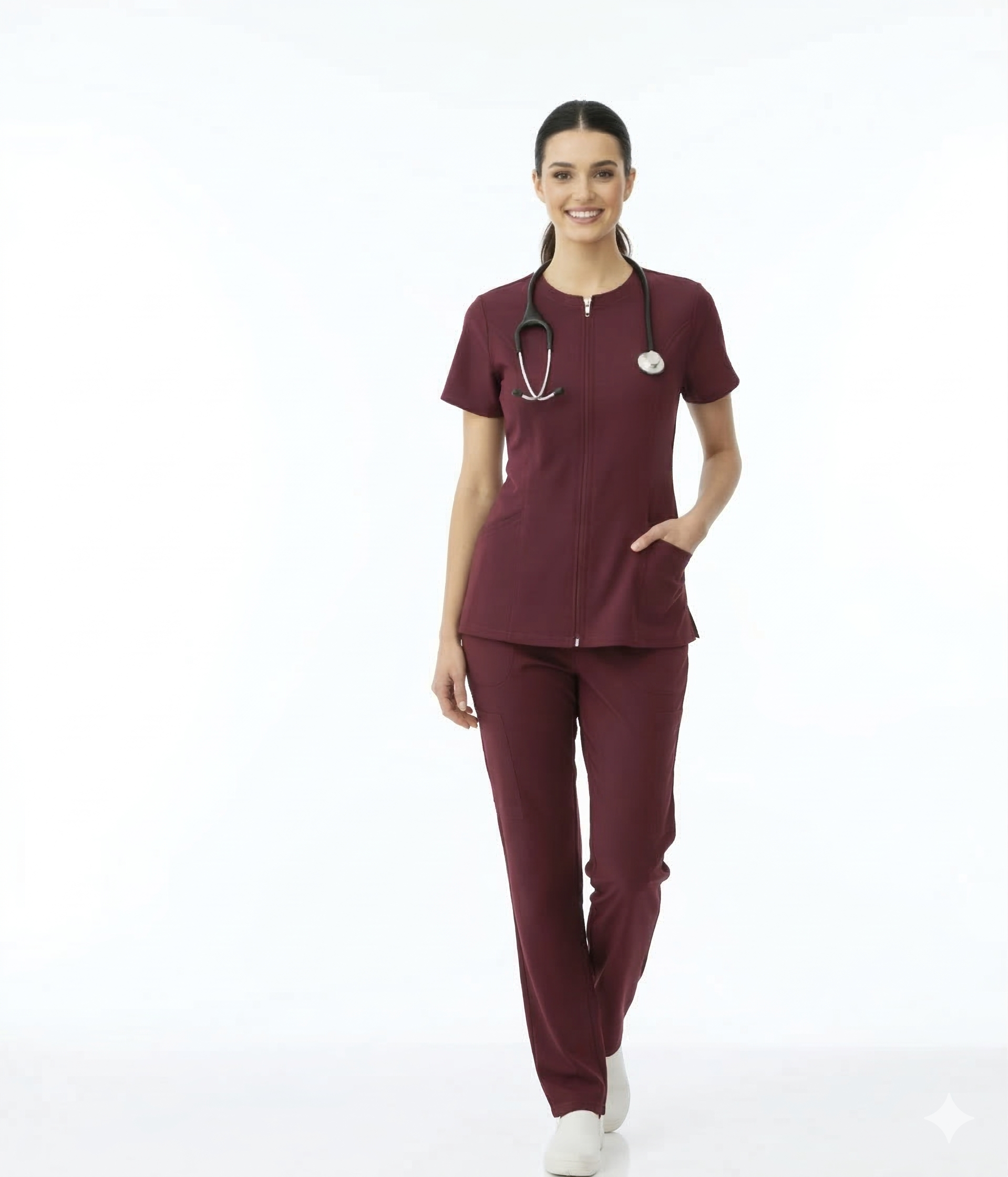 Destaca tu profesionalismo con este uniforme médico antifluido color vino tinto, diseñado especialmente para quienes buscan comodidad, elegancia y practicidad en su día a día.