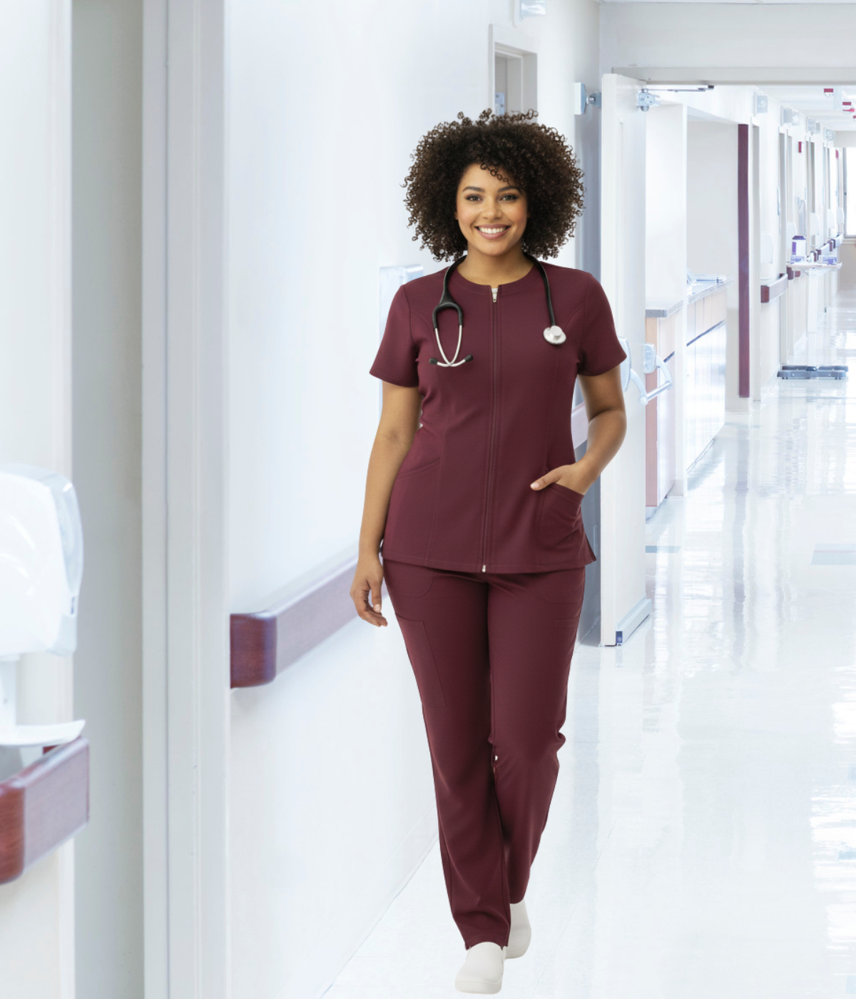 Uniforme Médico Vinotinto Antifluido en Lotus Lycra Lafayette – Mujer